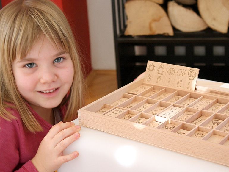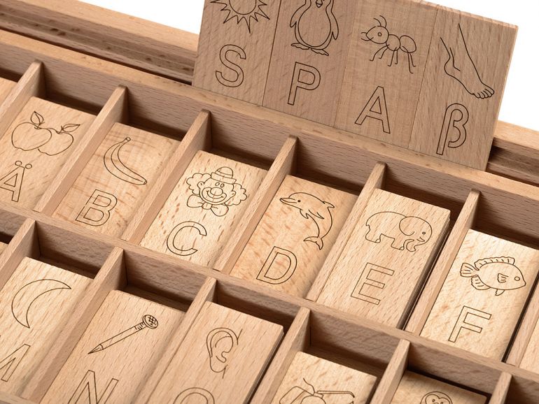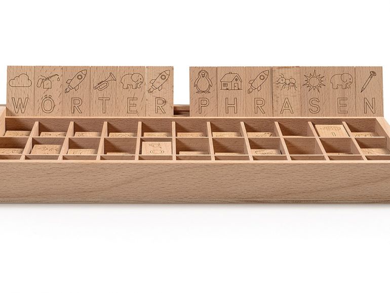 Am Boden der Schachtel sind die Buchstaben und Symbole in das Holz eingebrannt, sodass jeder Buchstaben seinen Platz hat, was den Kindern beim Aufräumen der Plättchen in die Schachtel hilft.