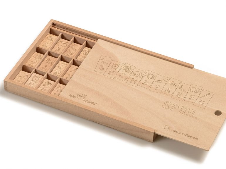 Buchstabenspiel ist aus massivem Buchenholz hergestellt und die Symbole und Buchstaben sind in das Holz eingebrannt.
