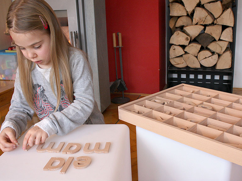 Das didaktische Set HOLZALPHABET wird unterschiedlich eingesetzt, angepasst an den verlangten Schwierigkeitsgrad und das Alter des Kindes.