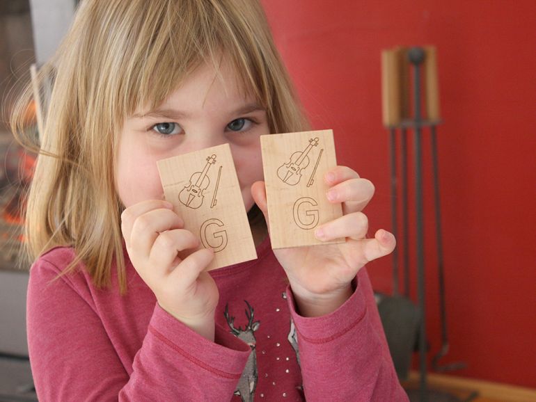 Das Memory-Spiel ist aus massivem Buchenholz hergestellt und hat eingebrannte Symbole sowie große Druckbuchstaben.