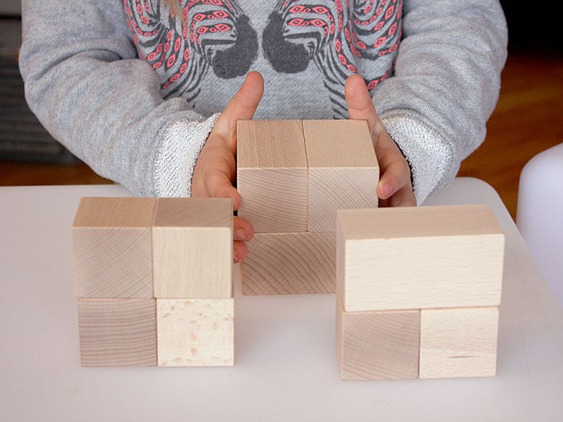 Otroci tako na konkreten način preko igre ali usmerjeno spoznavajo, na koliko različnih načinov lahko sestavijo kocko – celoto ; iz dveh polovic, ene polovice in štirih osmin, dveh četrtin in ene polovice,…!