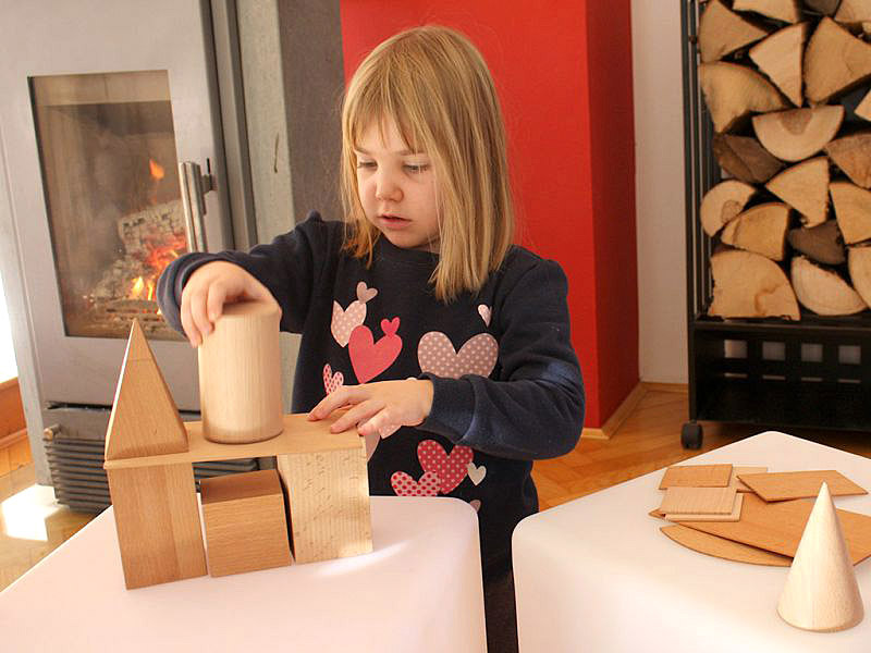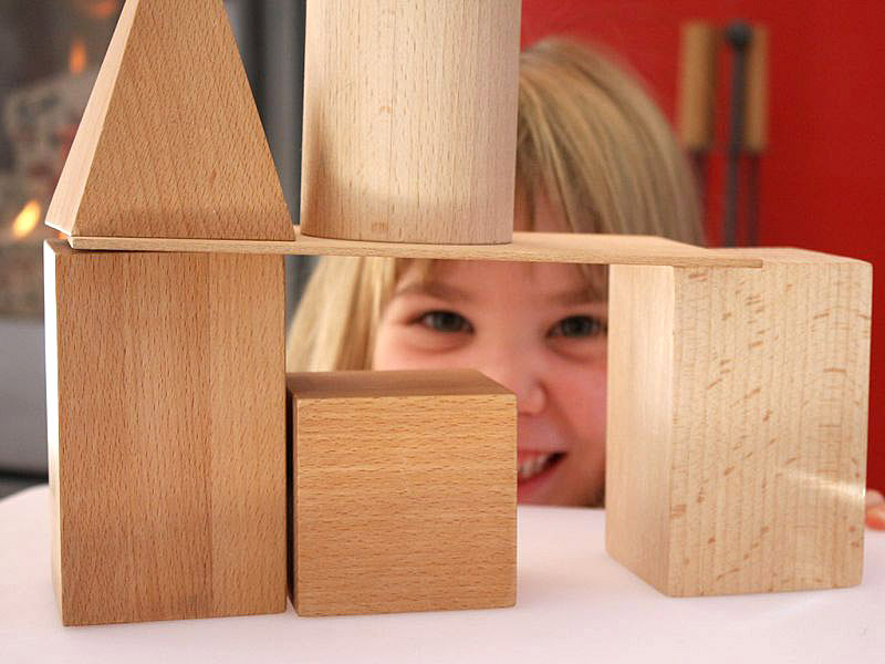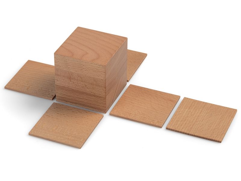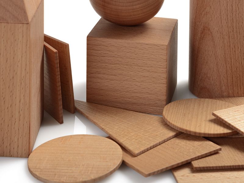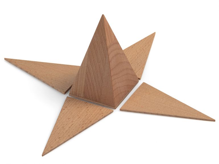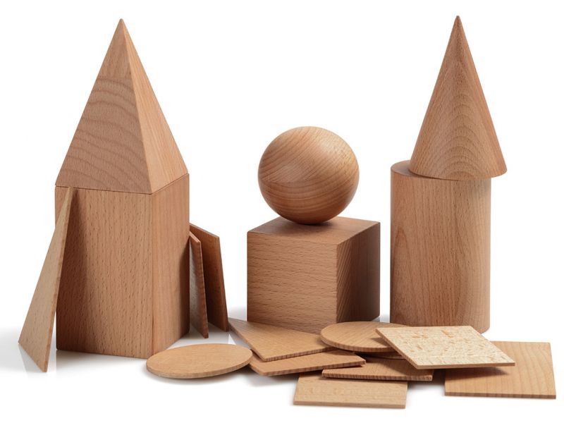Geometrijska telesa so narejena iz masivnega bukovega lesa. Visoka so 11 cm in imajo 7 cm premera.