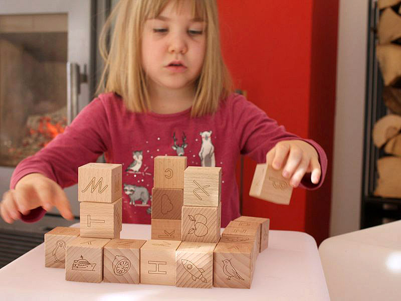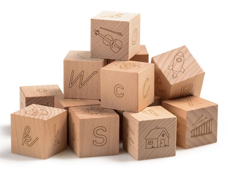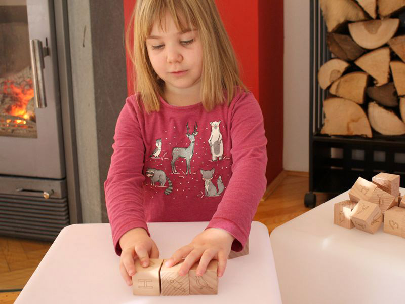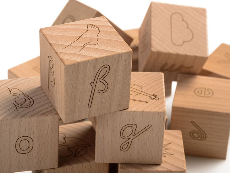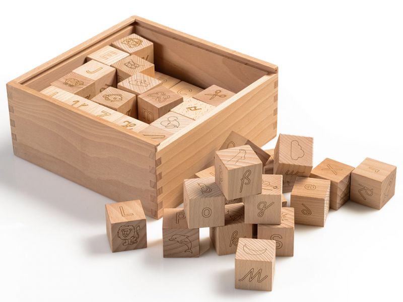 So odličen pripomoček za otrokov prvi stik s črkami. Lesene kocke so potiskane s simboli in črkami vseh štirih abeced: velike in male tiskane črke, ter velike in male pisane črke.