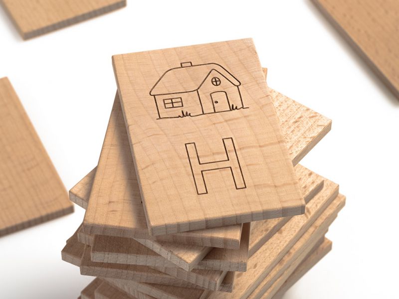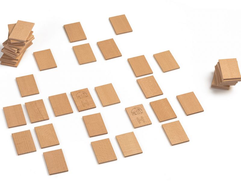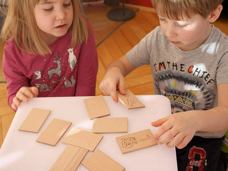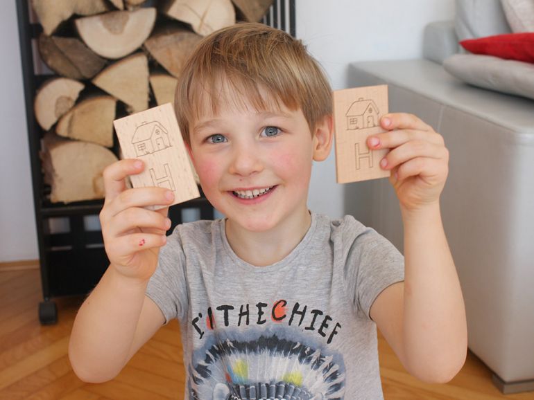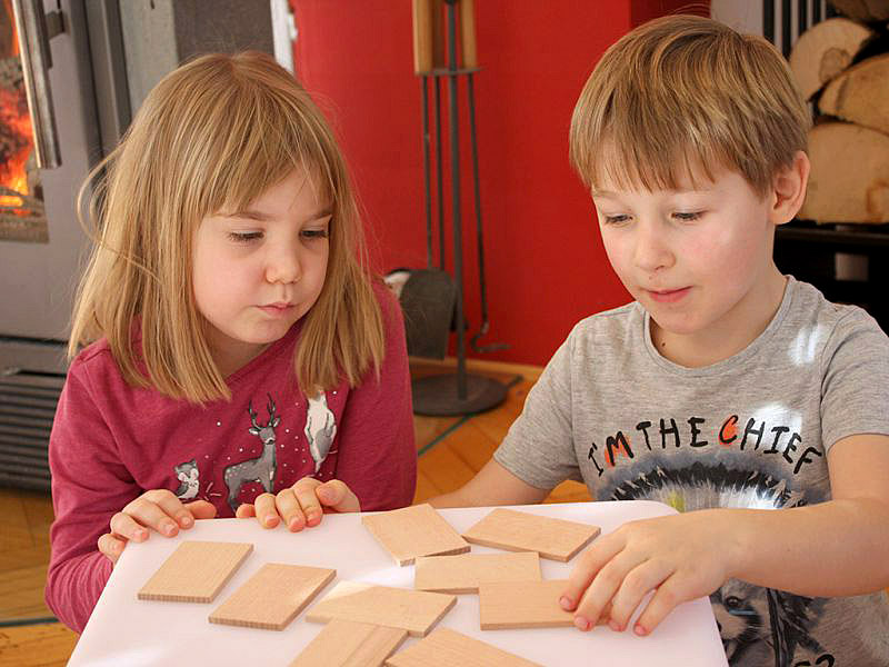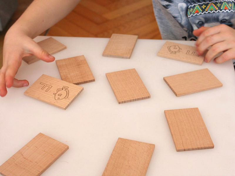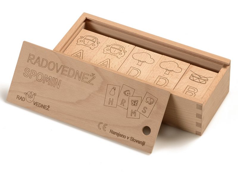 Igra spomin je narejena iz masivnega bukovega lesa, z vžganimi simboli in velikimi tiskanimi črkami.