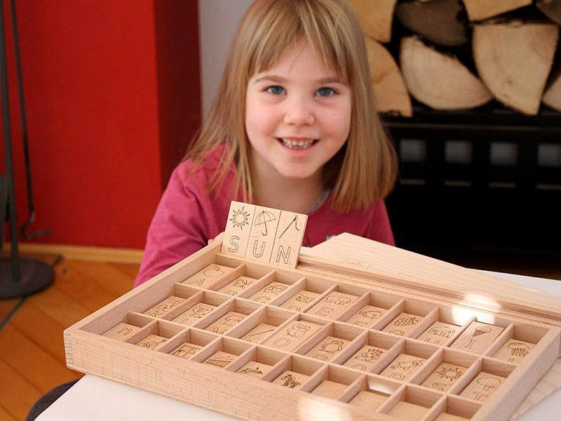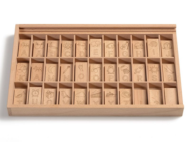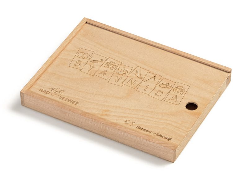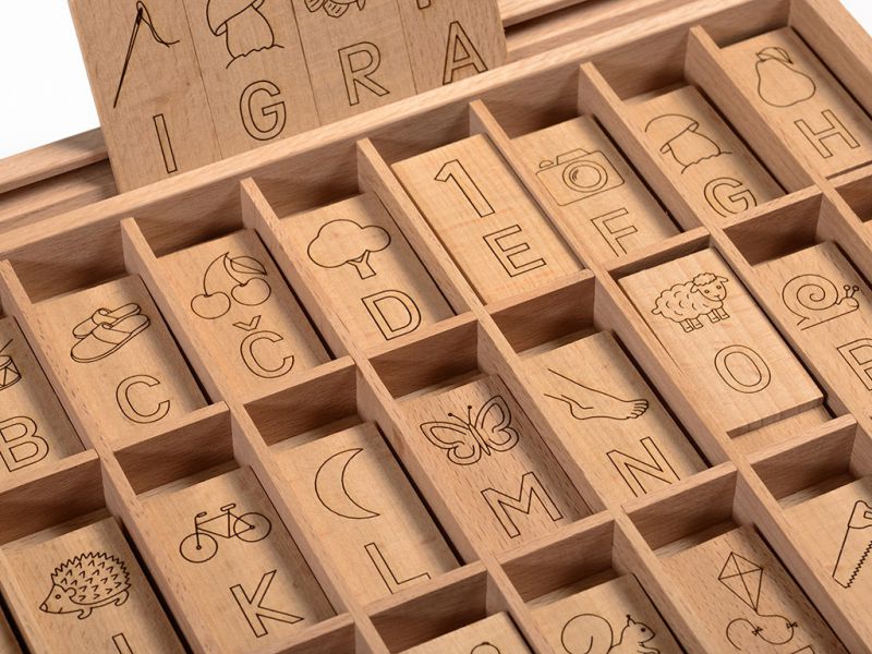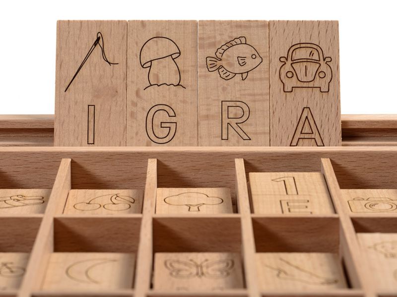 Na dnu škatle, so črke in simboli vžgani v les, tako da ima vsaka črka svoj prostor, kar otrokom pomaga pri pospravljanju ploščic v škatlo.