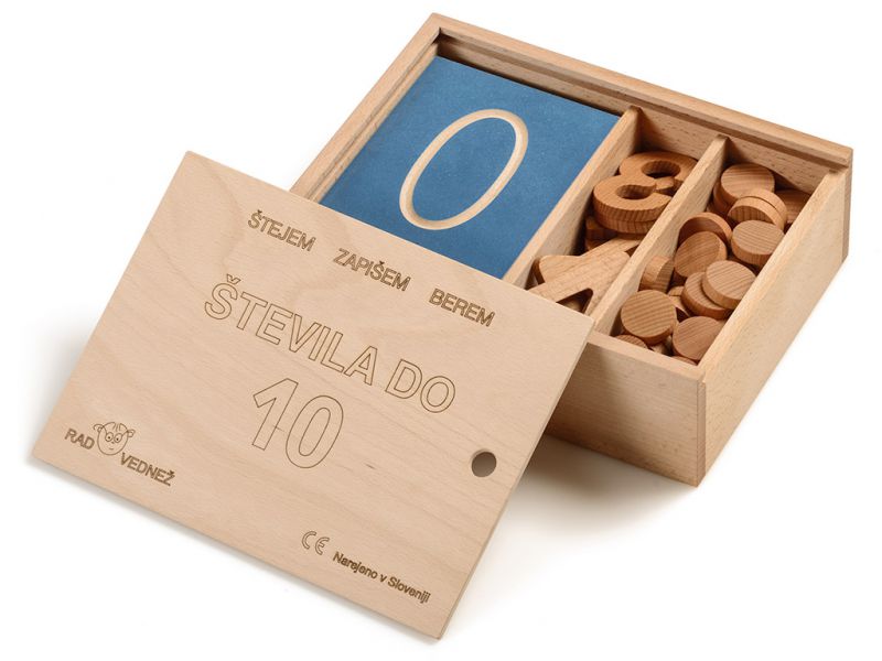 Didaktični komplet vsebuje učni material, ki otroke spodbuja k ŠTETJU, BRANJU in ZAPISU števil do 10. S konkretnim pristopom in naravnim materialom »radovedneži« zaznavajo števila z vidom, sluhom in tipom.