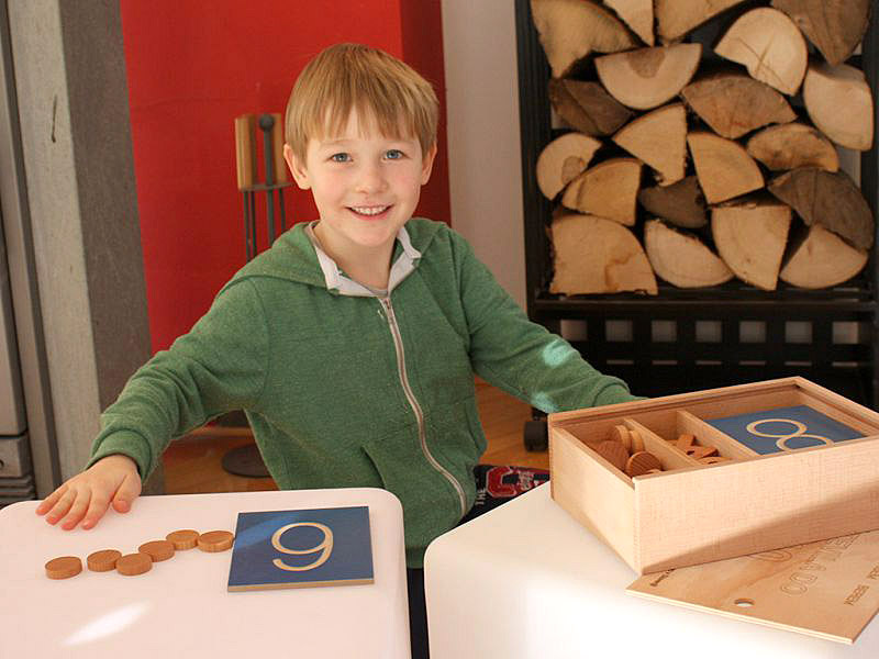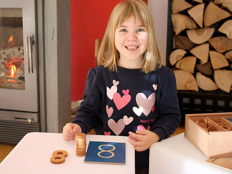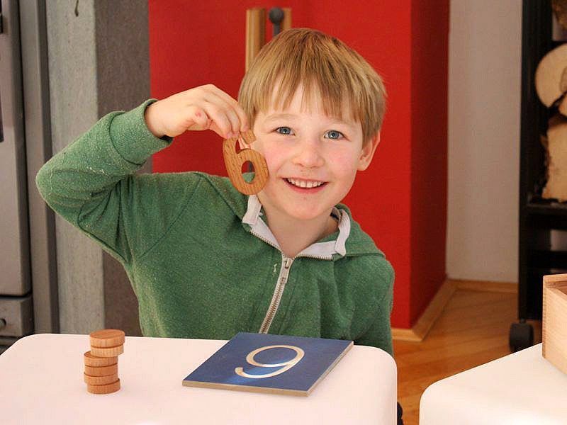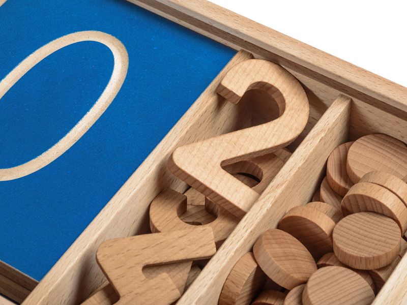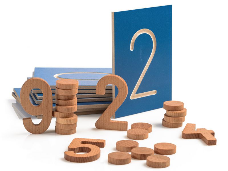 Števila iz masivnega lesa lahko otroci primejo v roke in otipajo obliko, jo poskušajo s prstom narisati na del svojega telesa, najdejo v »vreči«... Števila razvrstimo v vrsto od 0 do 10. Poleg ali pod njih postavimo lesene žetone in sicer toliko žetonov, kolikor jih ustreza danemu številu.Otrok lahko spoznava predhodnike, naslednike števil s prekrivanjem ali odvzemanjem števil v desetiški vrsti. Otrok števila POIMENUJE.